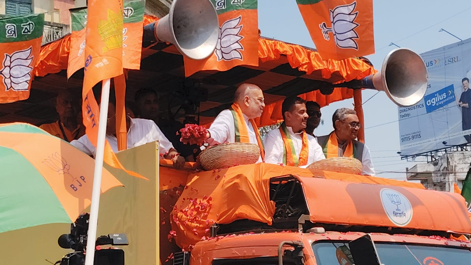 A High-Octane Procession: Mounted on a massive tableau, Shah and Adhikari were accompanied by candidates Swapan Dasgupta and Satarupa. The streets were painted saffron as supporters showered rose petals and chanted slogans. However, the atmosphere turned electric when the rally passed through Kalighat. TMC workers countered with ‘Joy Bangla’ slogans, leading to a heated face-off between the two political camps. Despite the tension, the procession culminated at the nomination center, marking a historic day for the constituency.